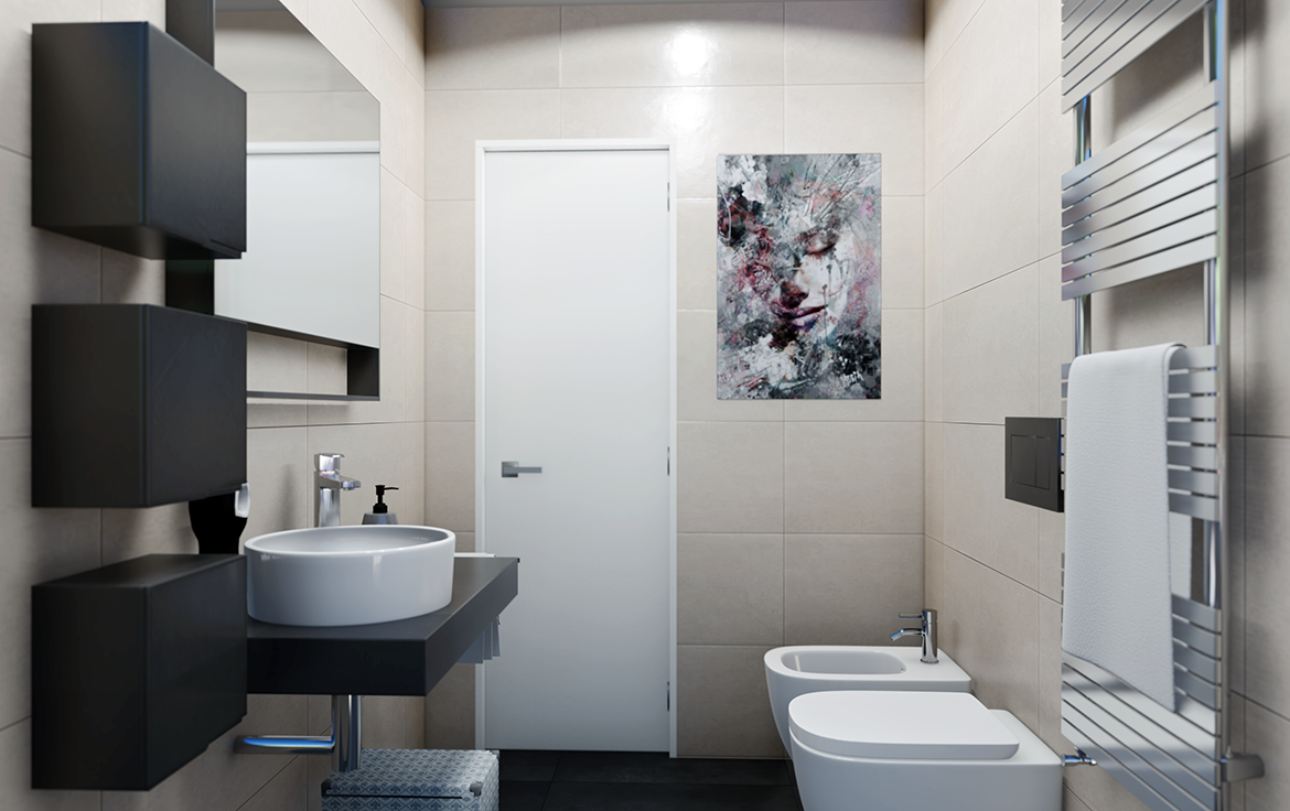 Il bagno ha sanitari sospesi con rubinetteria monocomando in acciaio.