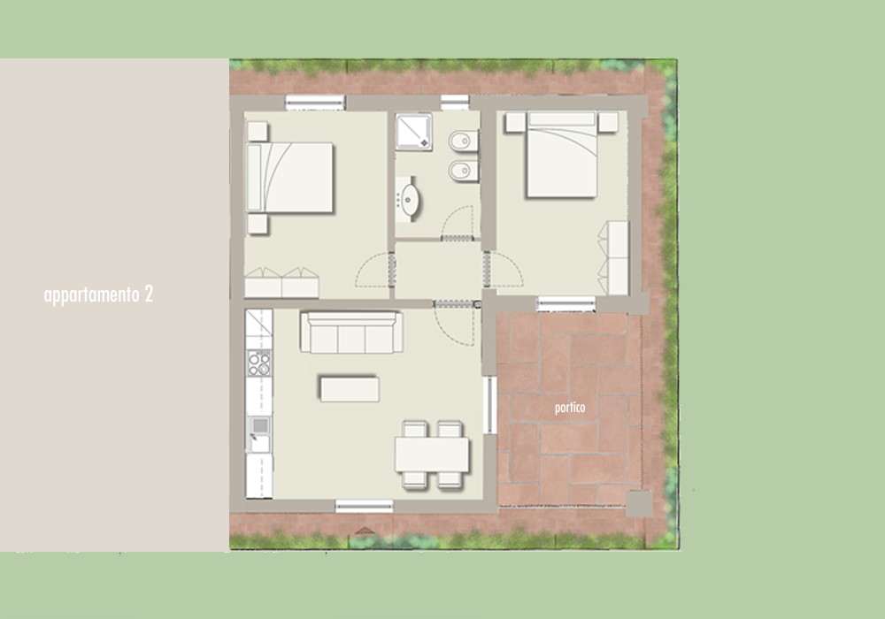 L’ingresso indipendente apre su un ampio e luminoso soggiorno con angolo cottura, dal quale si accede attraverso un disimpegno, al bagno e alle due camere da letto.
