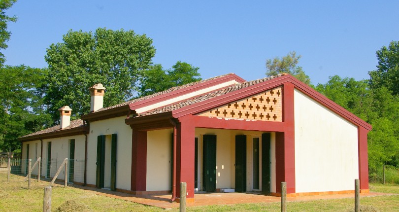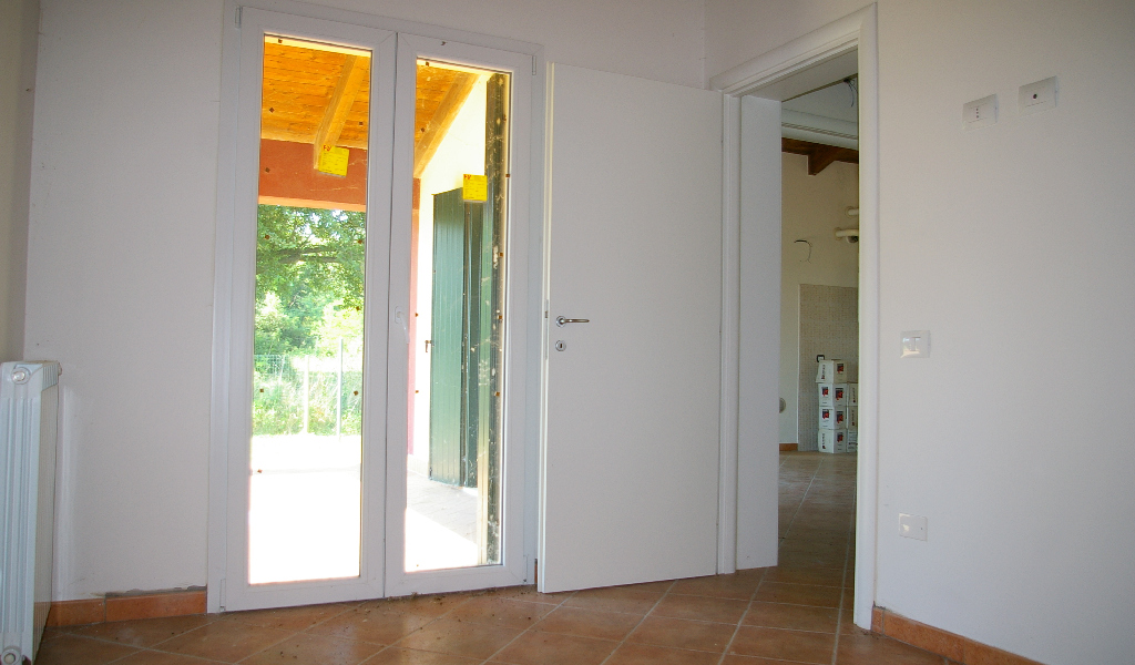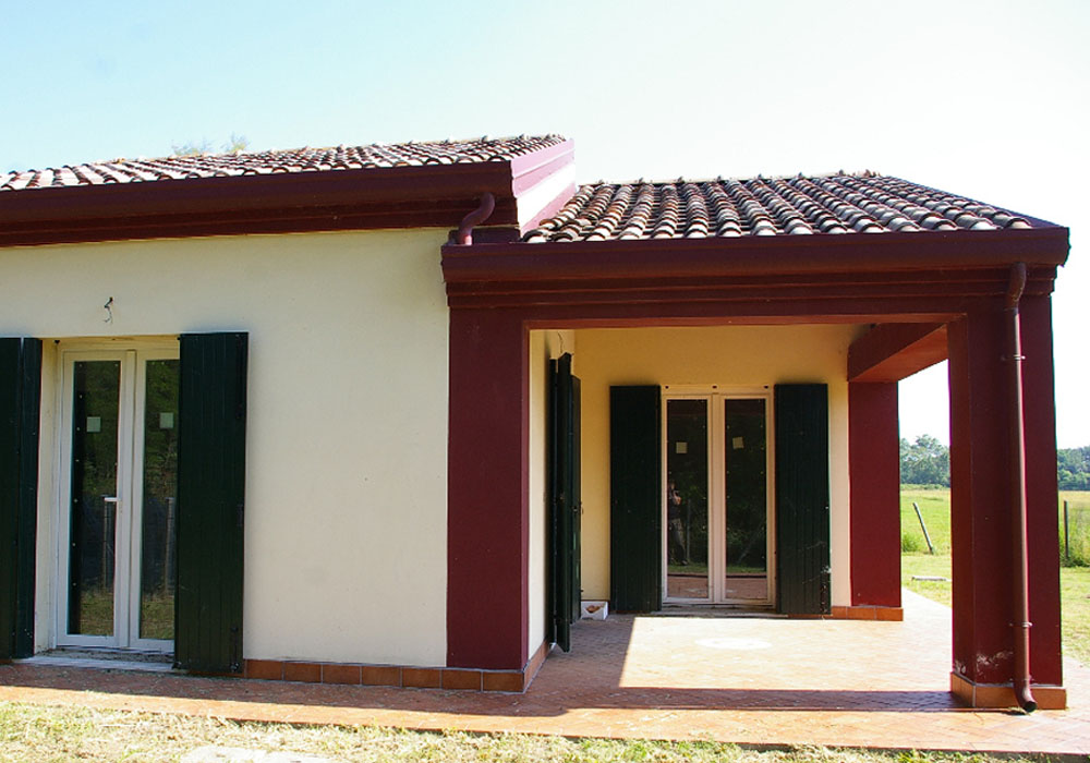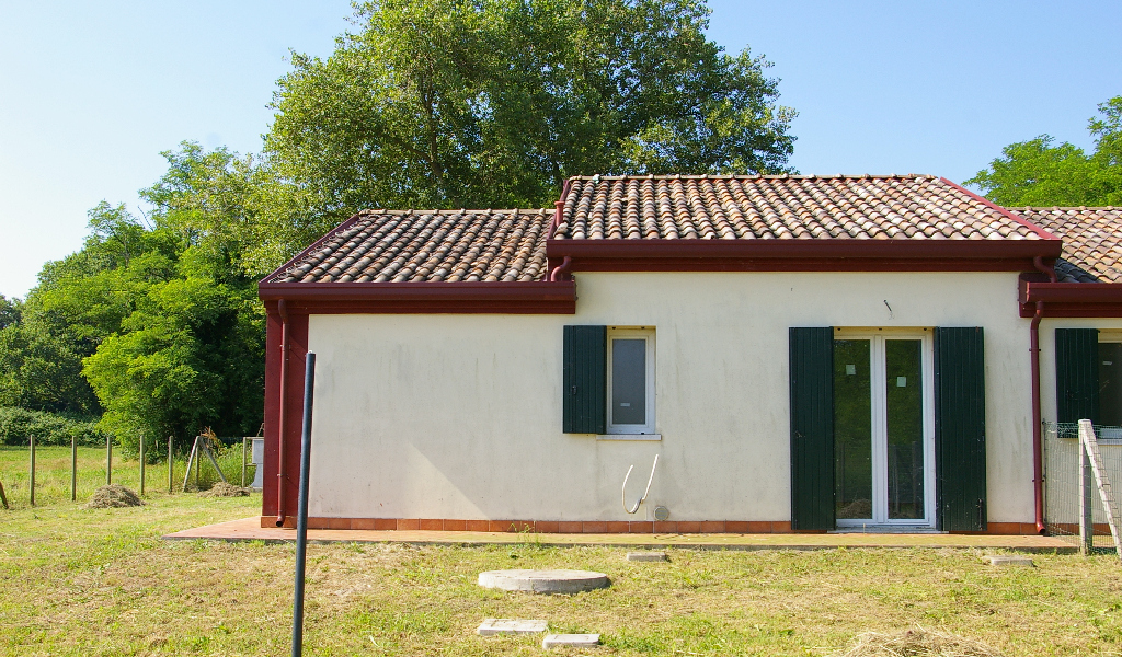 Tutte le stanze permettono di accedere al giardino esterno privato di 400 mq. Una delle due camere da letto e il soggiorno aprono su un ampio portico con travi a vista e pavimento in ceramica antigeliva.